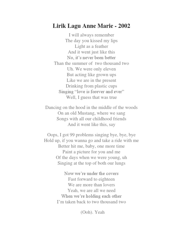 Lagu 2002 ini berperan cukup besar melambungkan nama Anne Marie di dunia musik. Pop Lirik Lagu 2002 Verse 1 I will always remember The day you kissed my lips Light as a feather And it went just like this No its never been better Than the summer of 2002 ooh Uh we were only eleven But acting like grown-ups Like we are in the present. Saya akan selalu ingat.